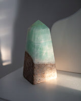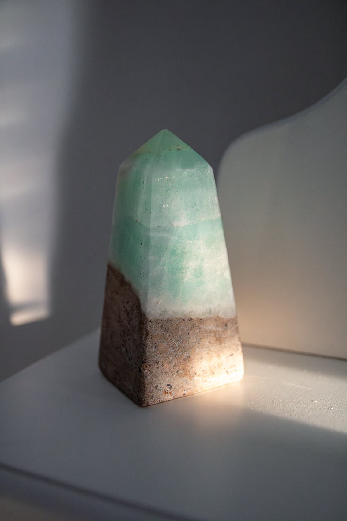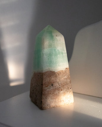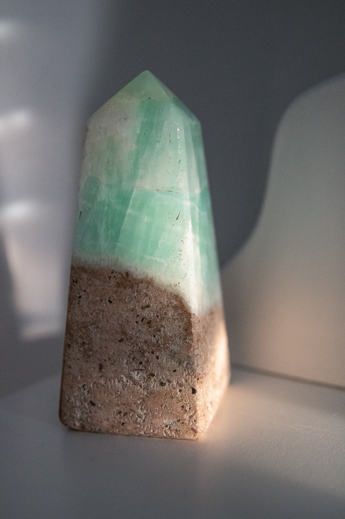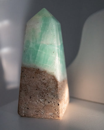 Wie das Meer auf Sand trifft hier hellblau bis türkiser Aragonit auf einen Sockel aus hellem Mineral und wirkt dadurch wie ein karibischer Strand.