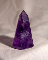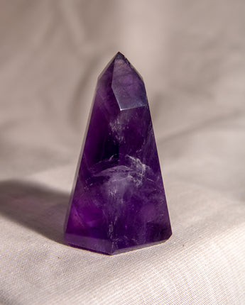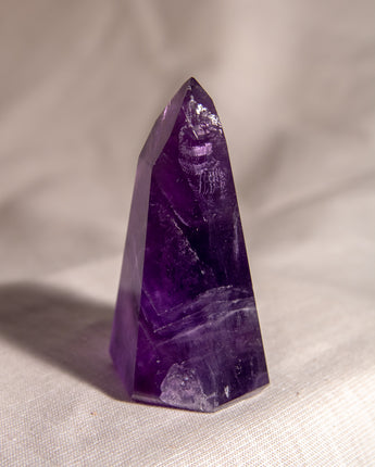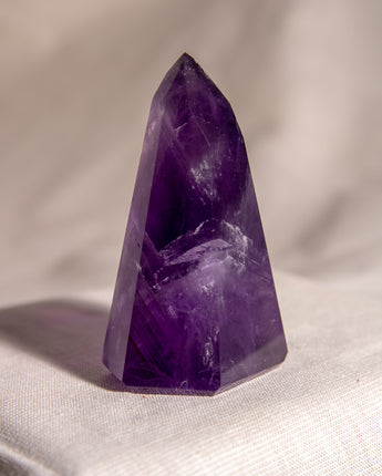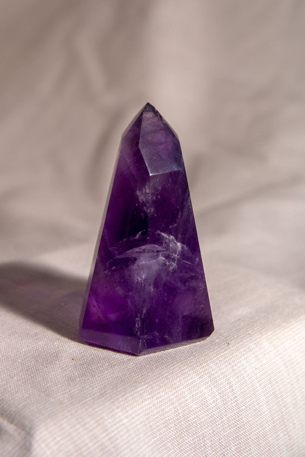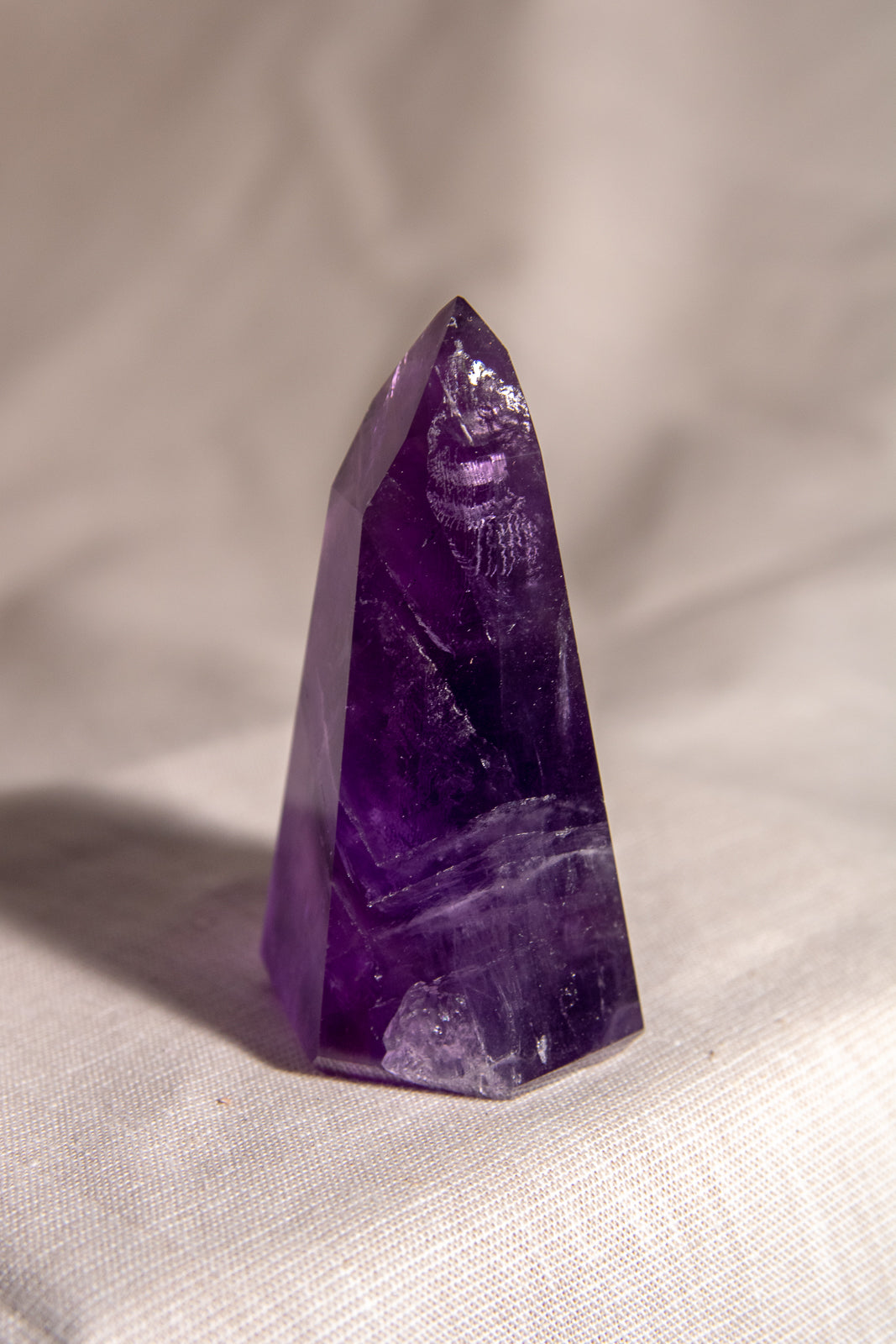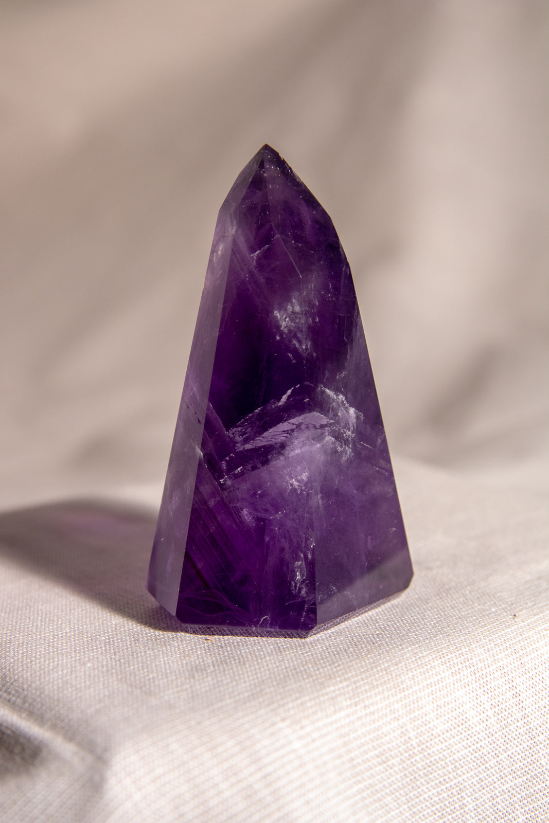 Dieser tief violette Turm hat eine ganz besondere Qualität. Durch die Klarheit des Amethysts werden die Strukturen im Inneren des Turms gut sichtbar.