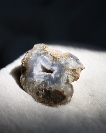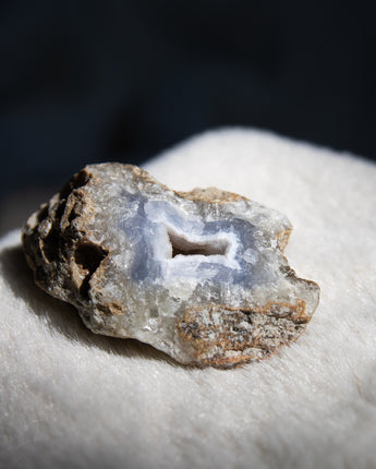 Der Blue Lace Achat ist bekannt für seine blauen bis weißen Bänderungen, die besonders im polierten Zustand sichtbar werden. In seiner rohen Form bleiben dafür Drusen erhalten, die der Achat bildet.